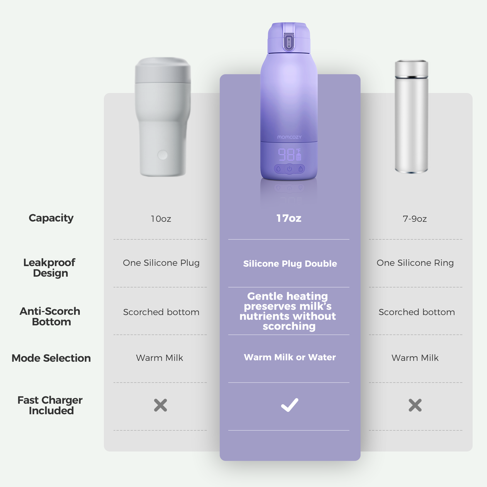 No more waiting! This milk warmer heats water to 104°F in just 3 minutes and warms refrigerated breast milk to 98°F in just 5 minutes, so your baby’s milk is always ready when needed.