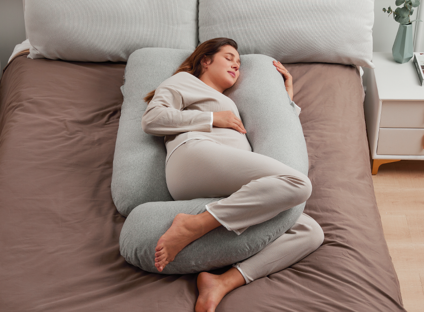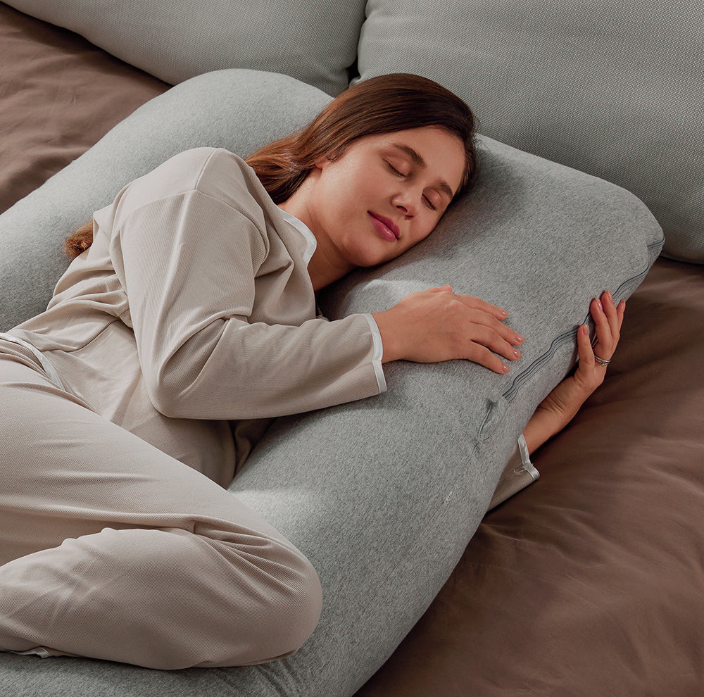 The Momcozy u-shaped pregnancy pillow provides customized relief, adjusting to any sleeping position.