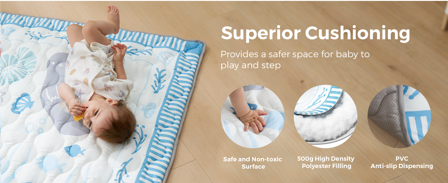 Extra-Thick Padding (500gsm): Designed with high-density filling to offer a soft yet supportive surface, helping protect baby’s arms, chest, and face during tummy time while promoting upper body development.