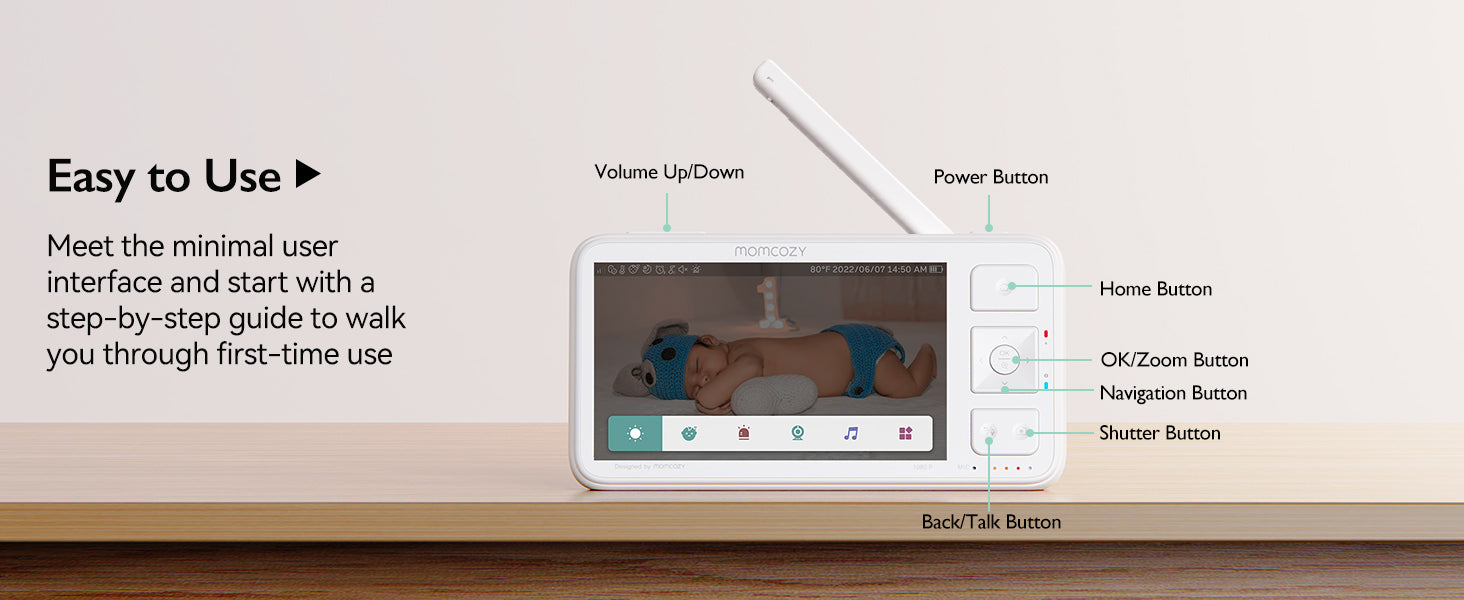 Introducing the new Momcozy Video Baby Monitor (BM03), designed for first-time and busy parents alike, embracing the essence of "smart parenting." The 5.5-inch large, 1080P high-resolution display offers a crystal-clear view of your baby at every moment, while the large 5800mAh battery lasts day and night. The strong signal supports an impressive 1640-feet range and is unstoppable by 2 walls, so you can check on your little one in the kitchen or living room. In addition, our video baby monitor can detect baby's motion, record one-minute videos, and save them on the included SD storage card for later playback. You can also capture a photo with a button press. So you won't miss your baby's special moments.