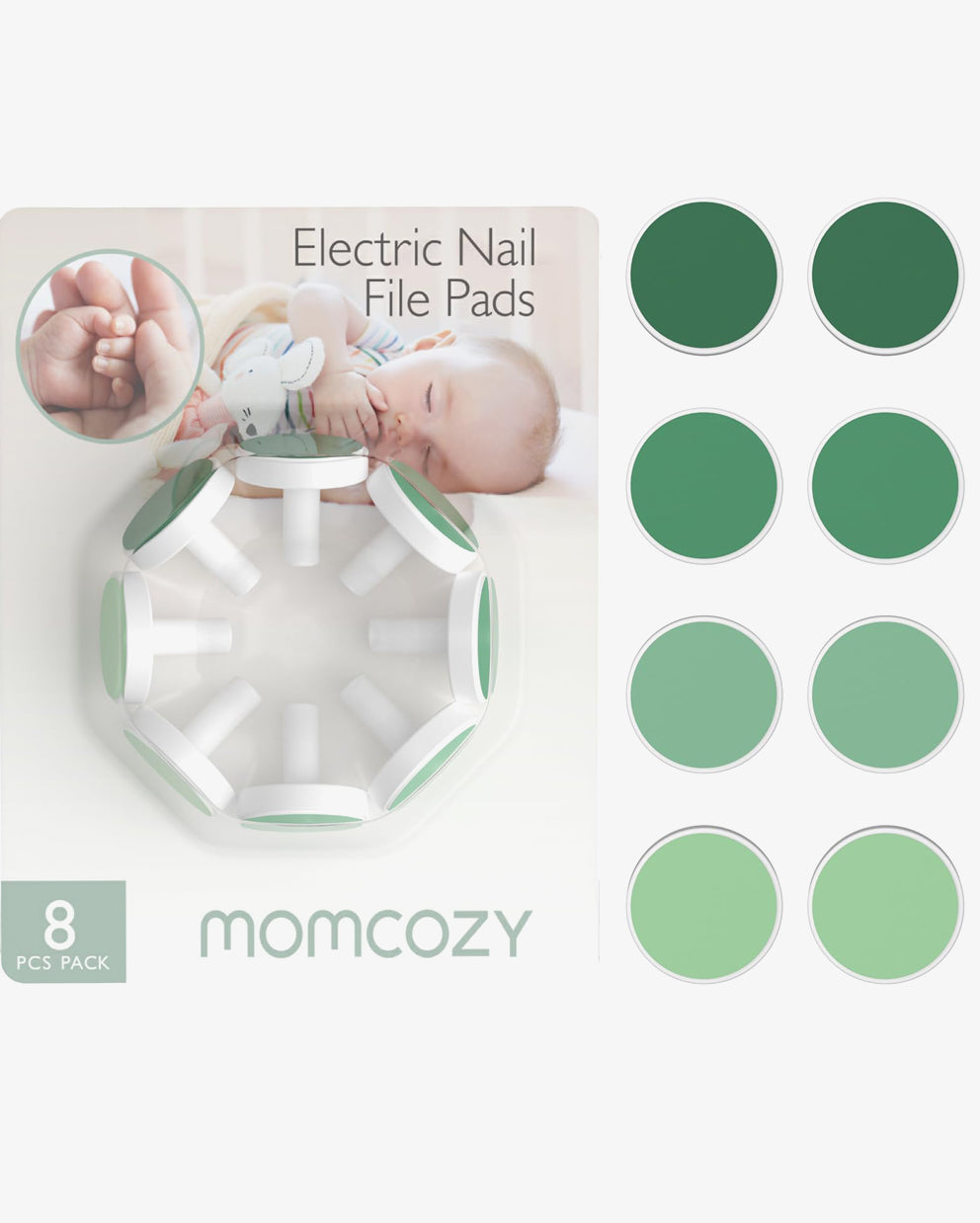 The Momcozy infant nail file comes with 4 replacement pads for babies and 3 additional pads for adult grooming. It offers 4 grinding speeds, making it suitable for newborns, toddlers, and adults alike.