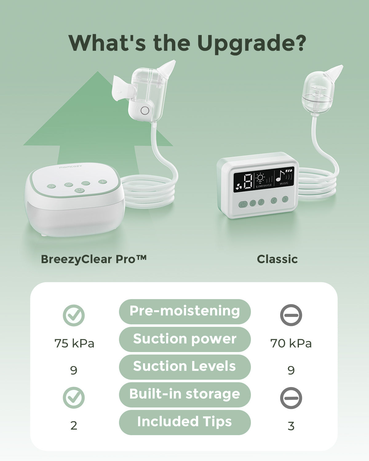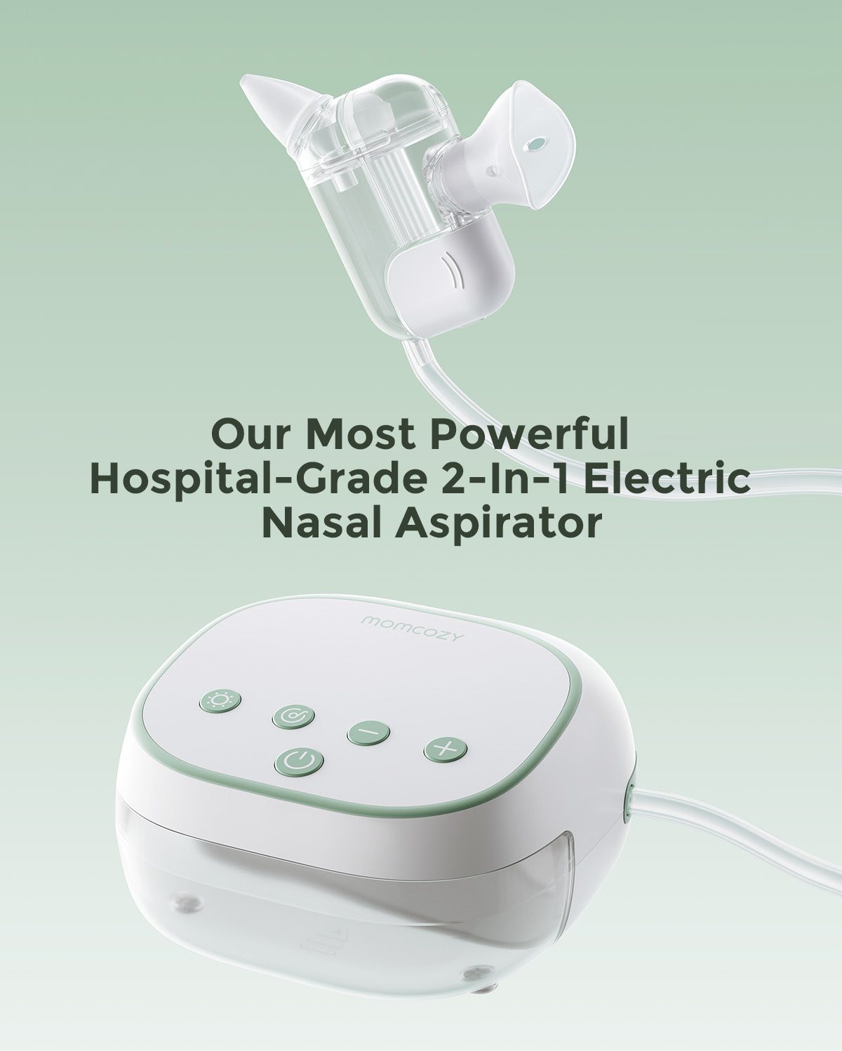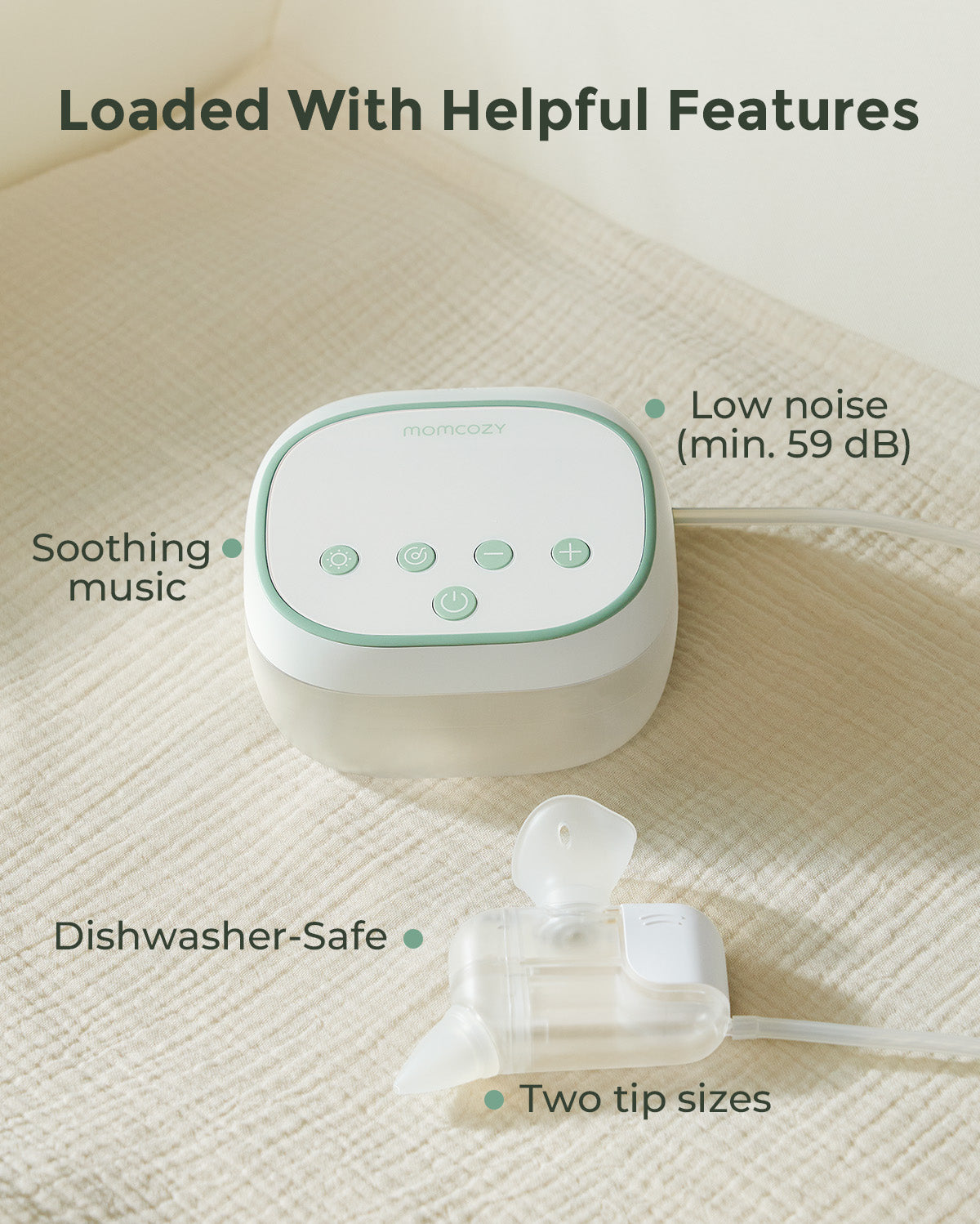 Momcozy BreezyClear Pro™ is a first-of-its-kind electric nasal aspirator featuring an innovative 2-in-1 design—engineered to make nasal care easier for parents and gentler for babies. This baby nose sucker first loosens stubborn mucus using a soft silicone mask that delivers targeted moistening, then safely suctions it out with hospital-grade power—up to 75 kPa of suction and 9 adjustable levels for customized comfort. Designed for infants and toddlers, this nasal cleaner includes two soft silicone tips, a 6-second auto shutoff for safe moistening, and operates at a quiet 59 dB to avoid startling sensitive ears. Soothing music, built-in storage, and dishwasher-safe components turn an often stressful task into a smoother experience.