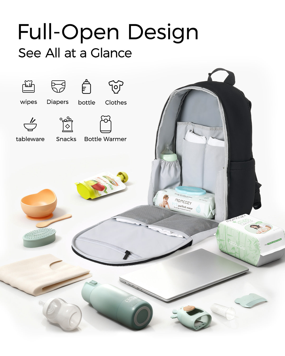 • [ Large Capacity, Organized Space with Wide-Open Design ] With a spacious 21L capacity and 14 thoughtfully designed compartments, this diaper bag backpack keeps all your baby essentials—clothes, diapers, bottles, toys, and more—visible and organized at a glance. The wide-open top allows you to see and access everything easily, just like a suitcase, making packing and finding items effortless. Perfect for both daily use and travel, it keeps parenting neat, easy, and stress-free.