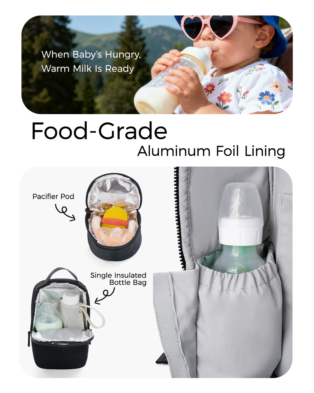 • [ Convenience with Thoughtful Baby Accessories ] This diaper bag comes with a food-safe pacifier pouch, a separate insulated bottle bag, and an extra-large changing pad. These practical accessories make baby care cleaner and easier, while also making it an ideal baby shower gift for new parents.