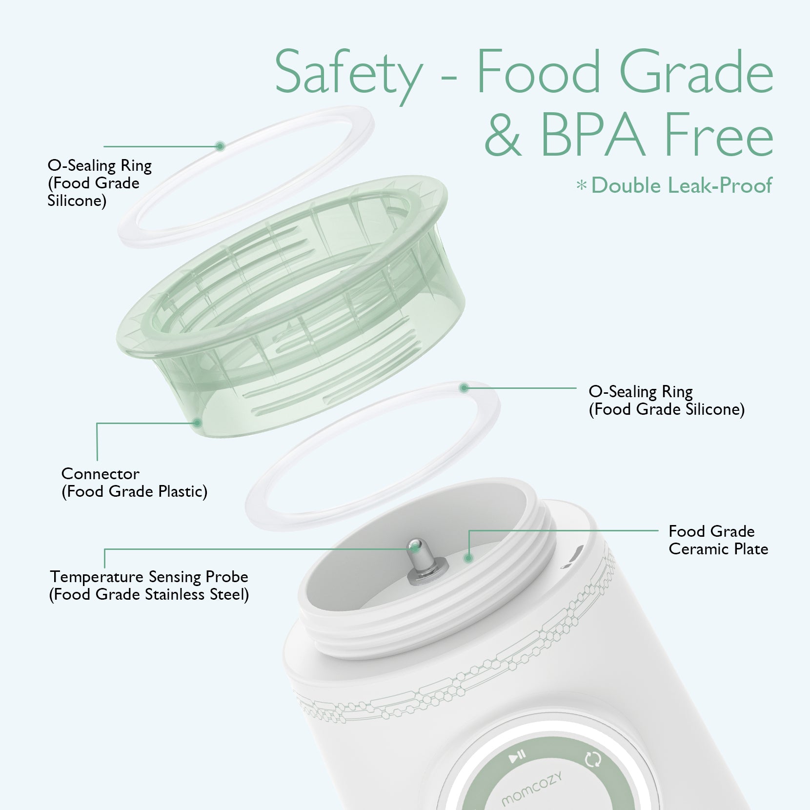 The Momcozy portable bottle warmer features a ceramic heating plate for fast and even warming, a stainless steel contact sensor, and a double silicone ring to prevent leaks.