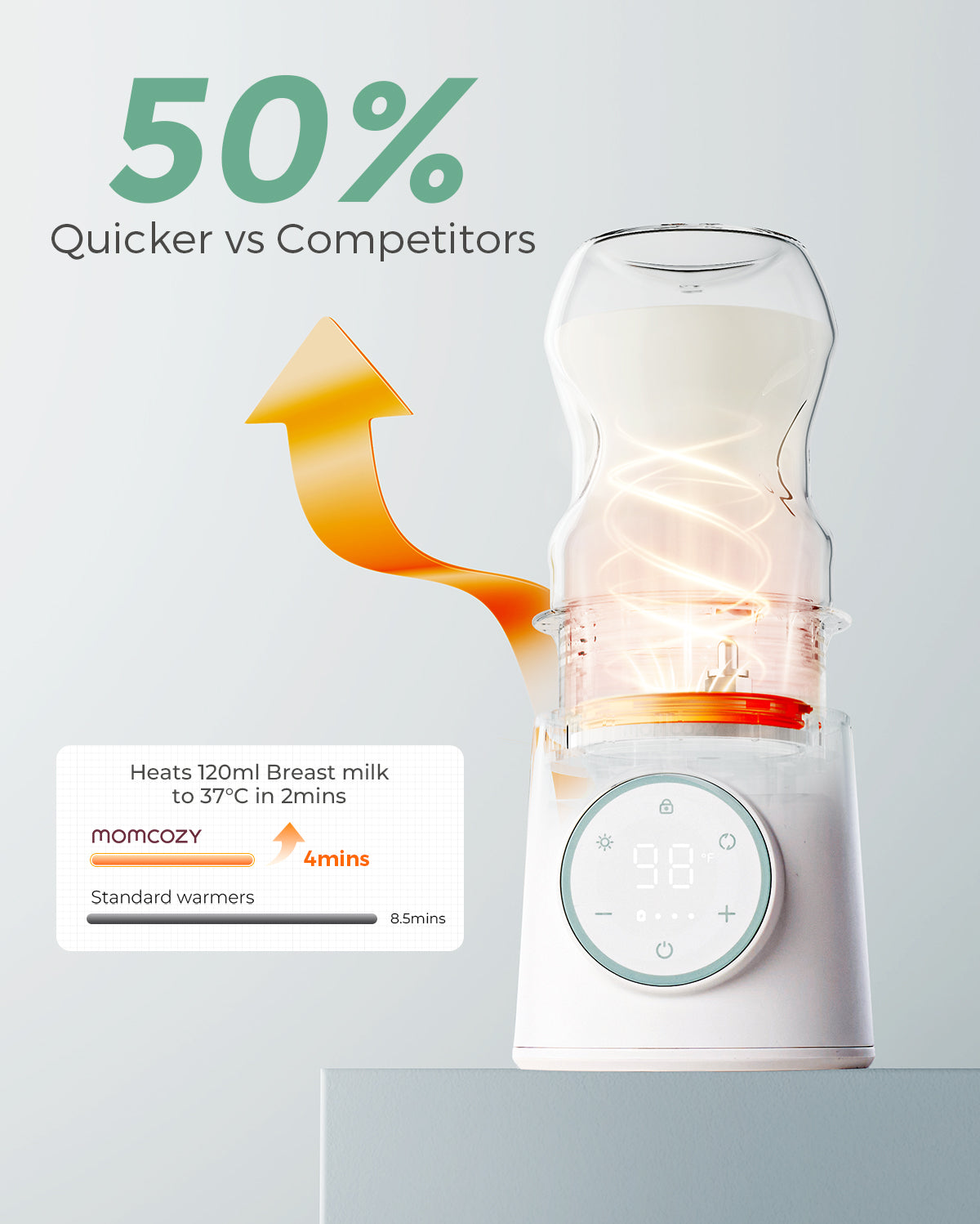The portable bottle warmer heats 4oz (120ml) of milk to 98°F in just 2 minutes.