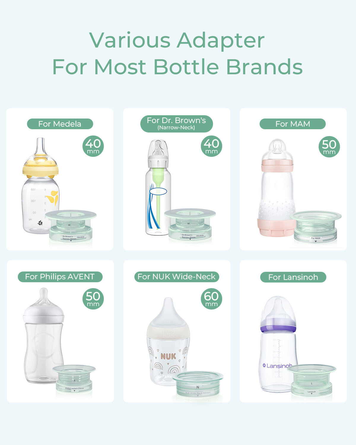 Includes 5 adapters compatible with most leading bottle brands: