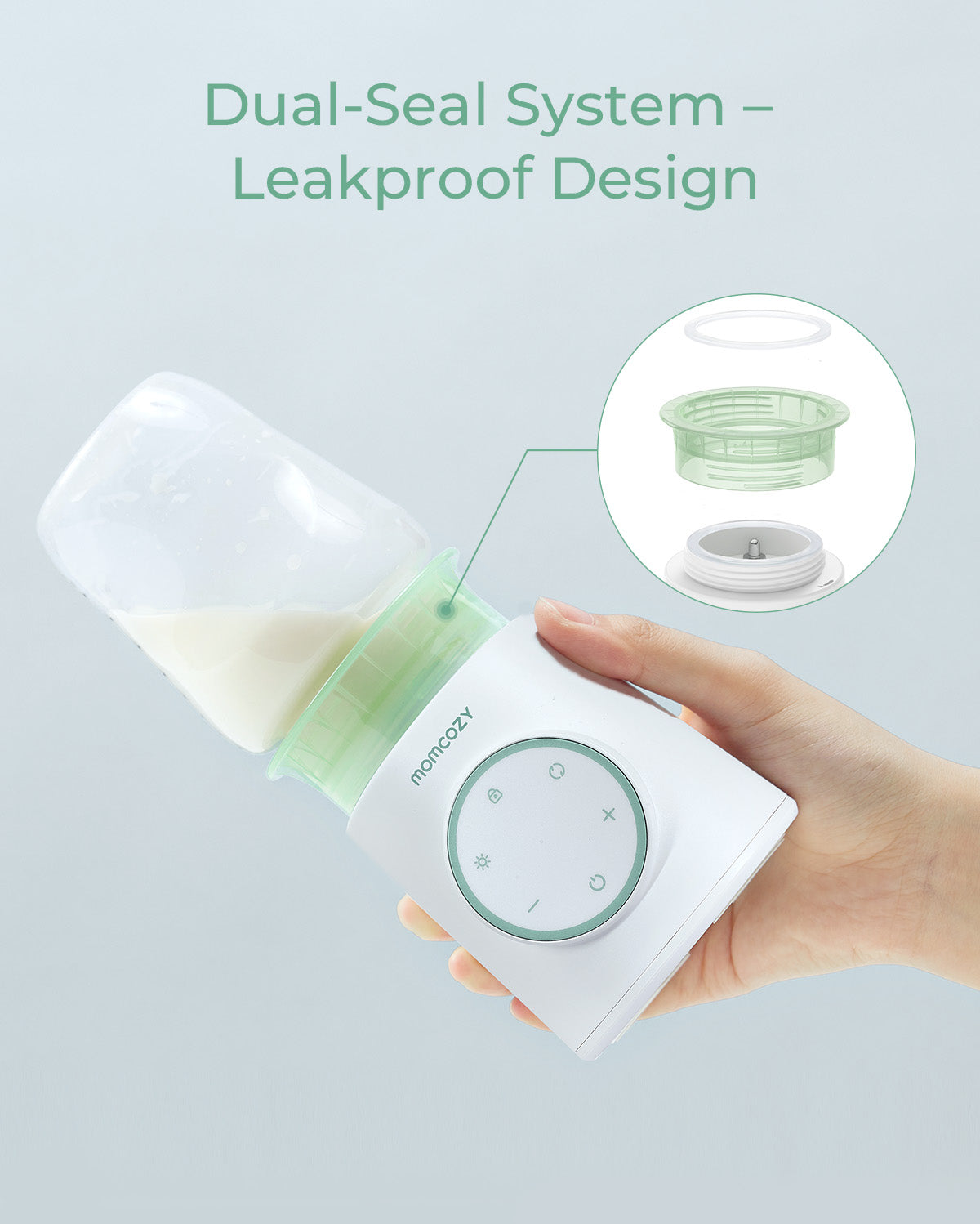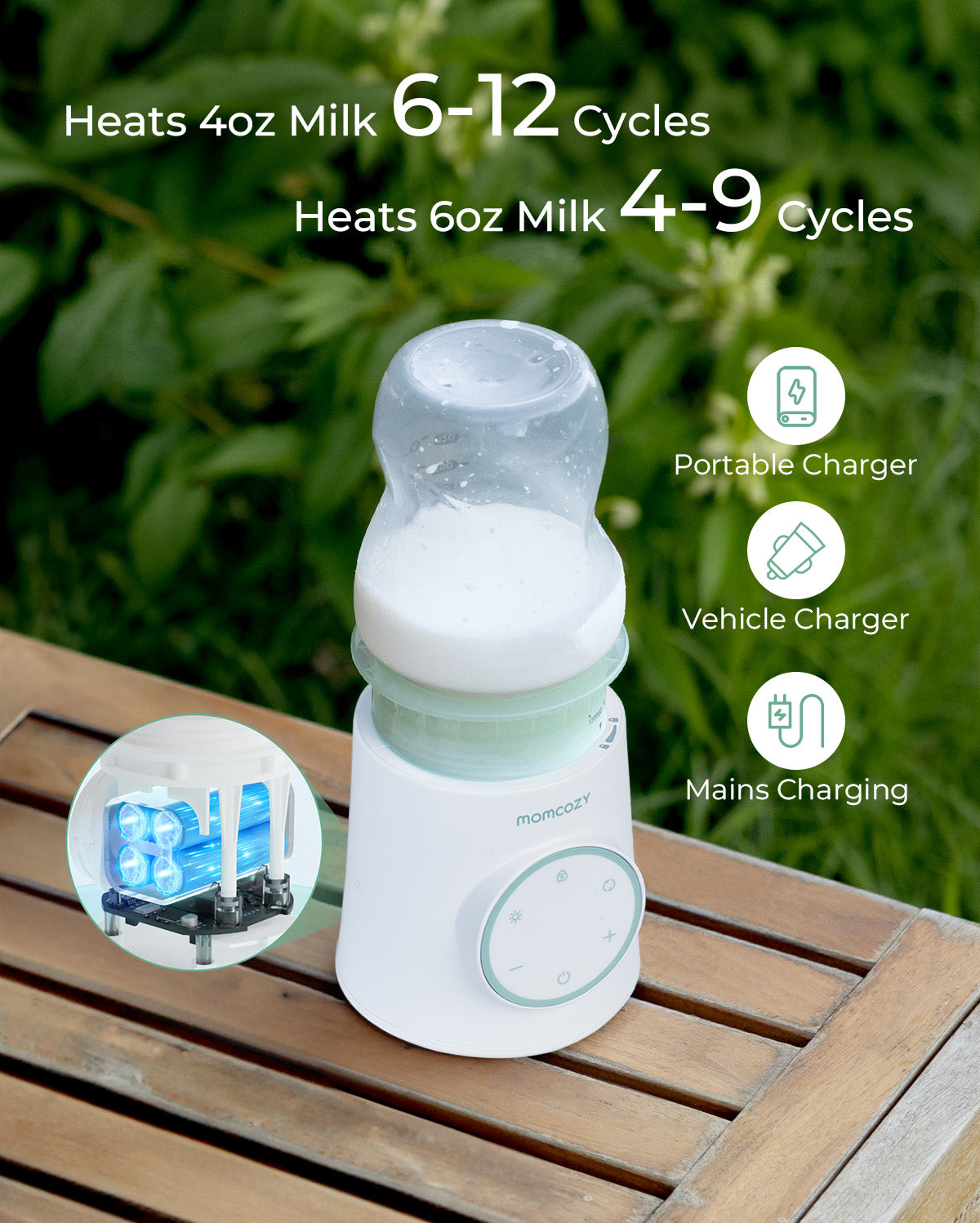 The Momcozy portable bottle warmer features a ceramic heating plate for fast and even warming, a stainless steel contact sensor, and a double silicone ring to prevent leaks.