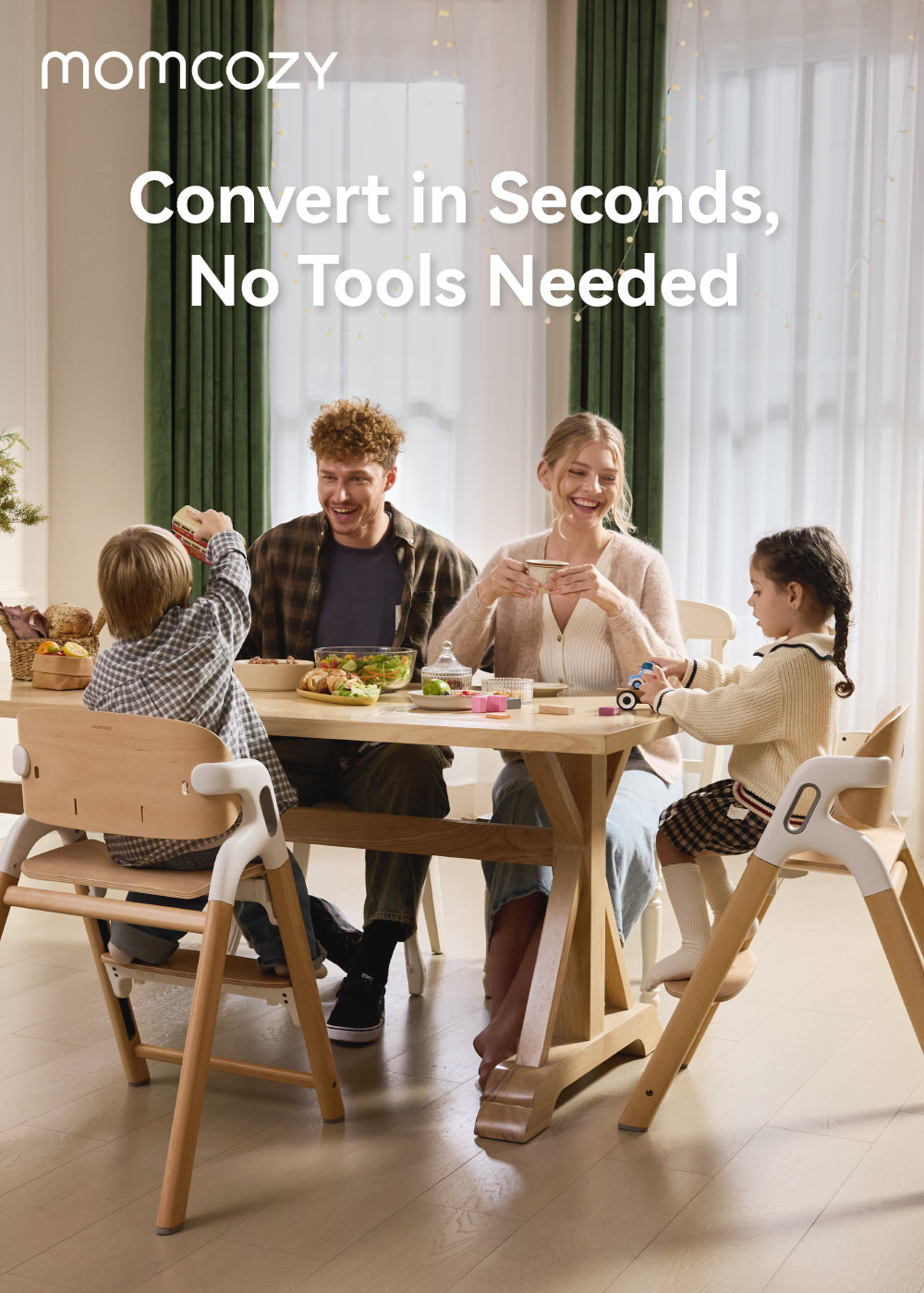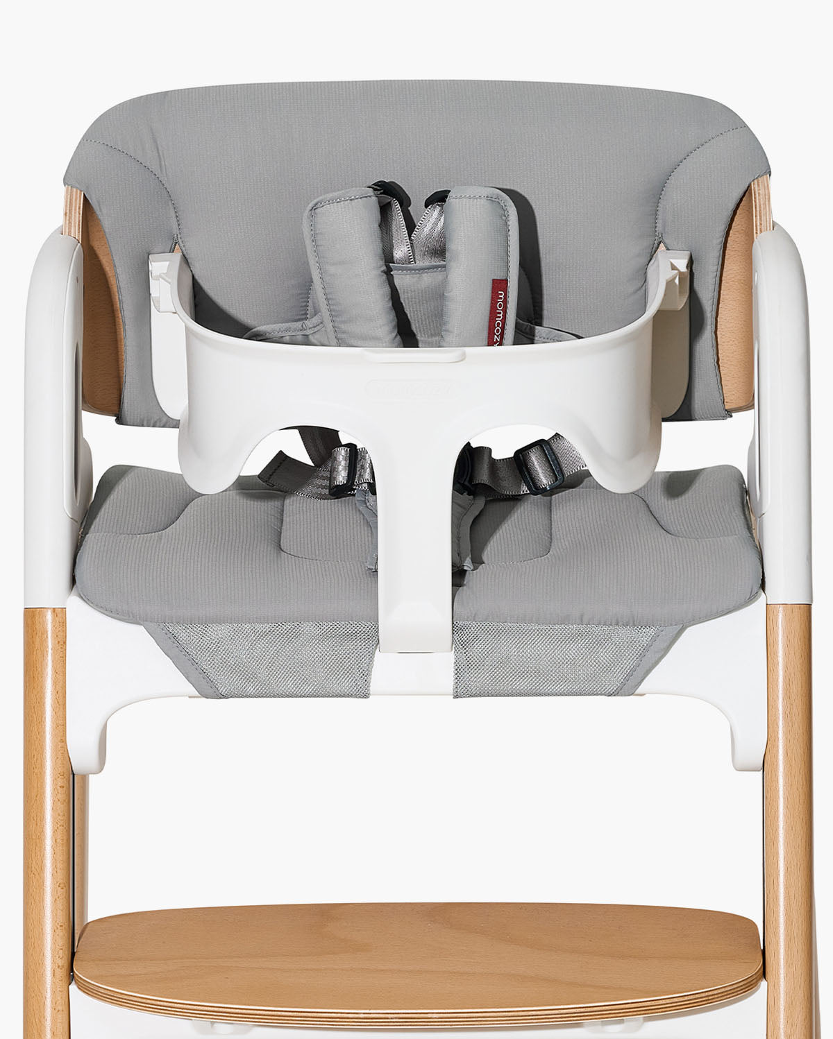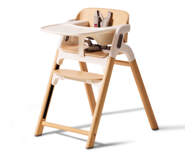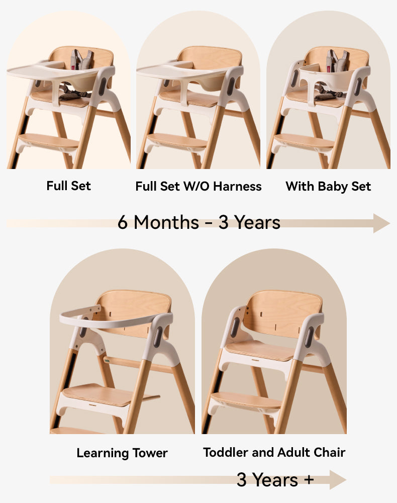 Momcozy DinerPal High Chair, designed to grow with baby from 6 months through adulthood, offers 5 seating modes from baby set to adult chair and supports up to 308 lbs. With adjustable seat and footrest positions, it ensures ergonomic comfort at every stage. Safety features include a five-point harness, stable triangular frame, and silicone rubber feet. The spacious, dishwasher-safe tray fits most suction bowls, and the chair is easy to clean with a wipeable surface and machine-washable harness. Built with quality FSC-certified beechwood and FDA-approved plastic to protect baby's health and for your peace of mind.